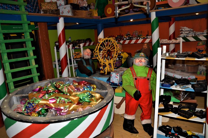Entro en otra casa que está llena de Elfos cenando y otros trabajando fabricando juguetes.